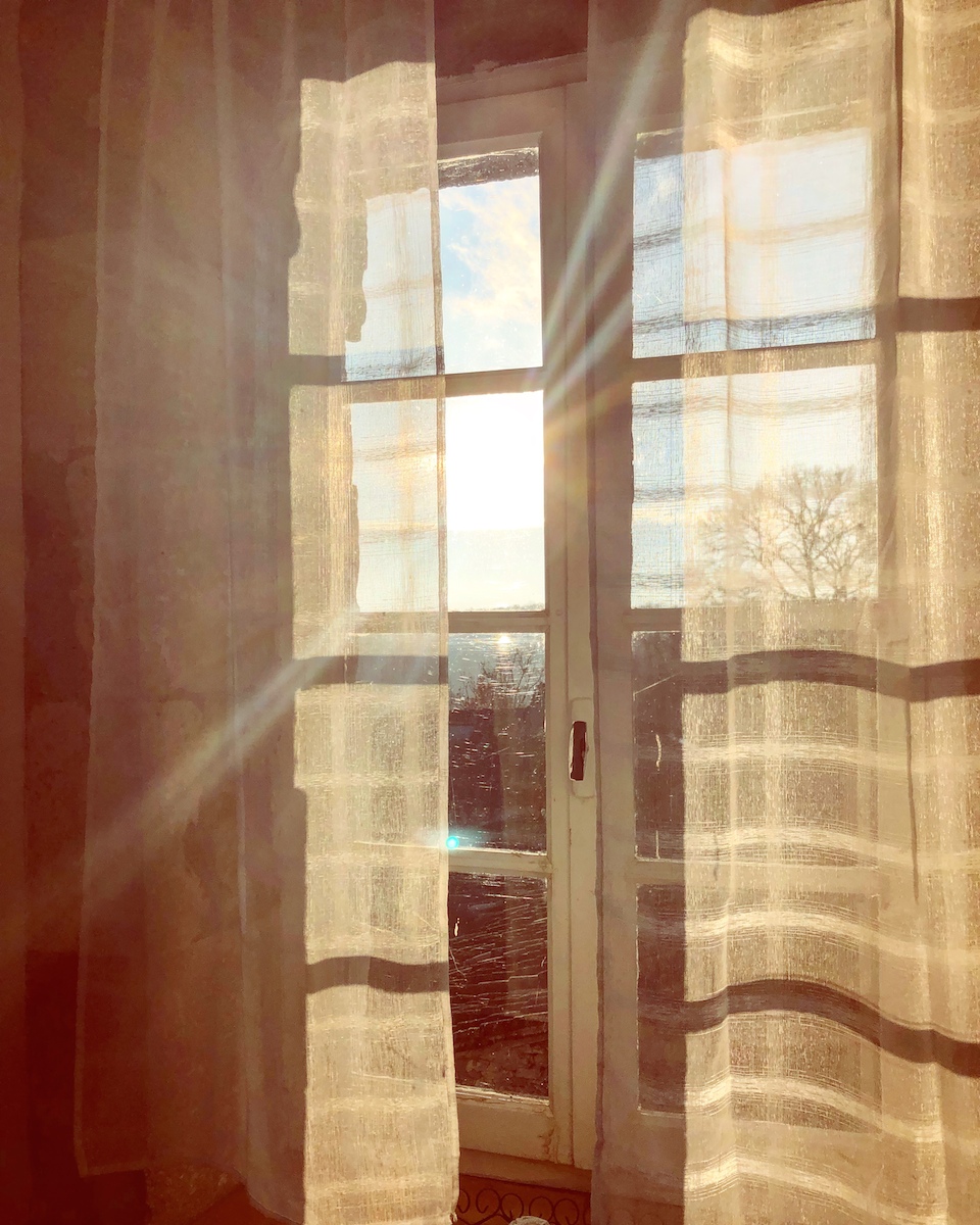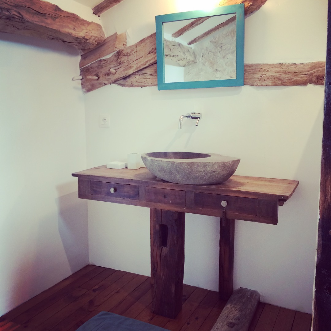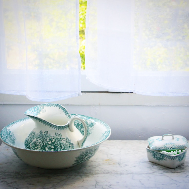 Coucou! Je suis si heureuse avec tous ces différents tons de vert, la couleur si dominante dans le hameau rempli de nature. Mes fenêtres donnent sur trois côtés de la maison, ce qui me permet de profiter de la plus belle lumière naturelle à tout moment de l’année. L’ensemble de salle de bain en porcelaine est un trésor trouvé dans l’une des brocantes locales – heureusement qu’il était vert!